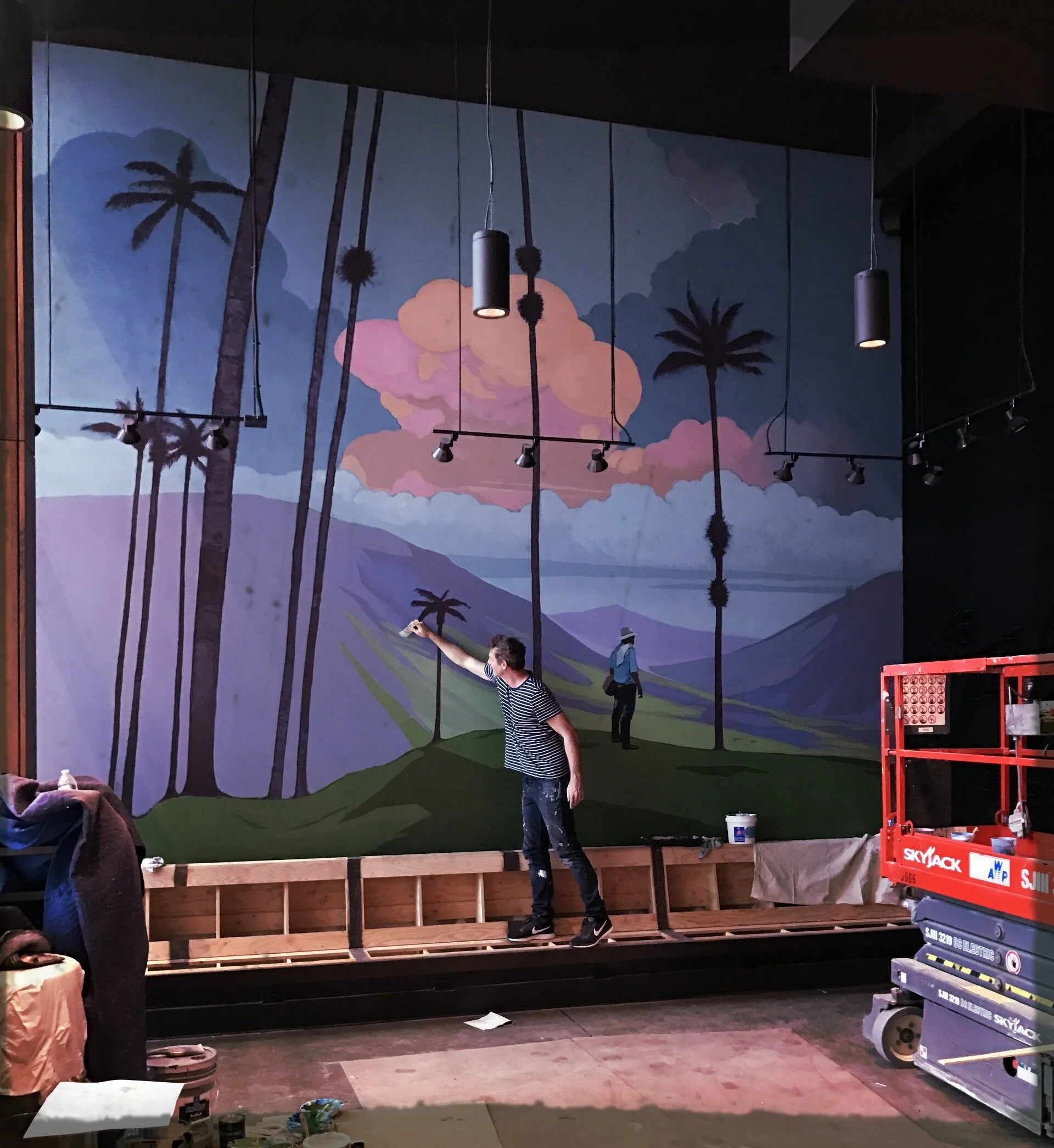 Bold Monk Brewery & Restaurant, Bar Dining Room (Work in progress). Hand-painted latex on plaster and cinder block. Concept and design: Super Delicious Walls.