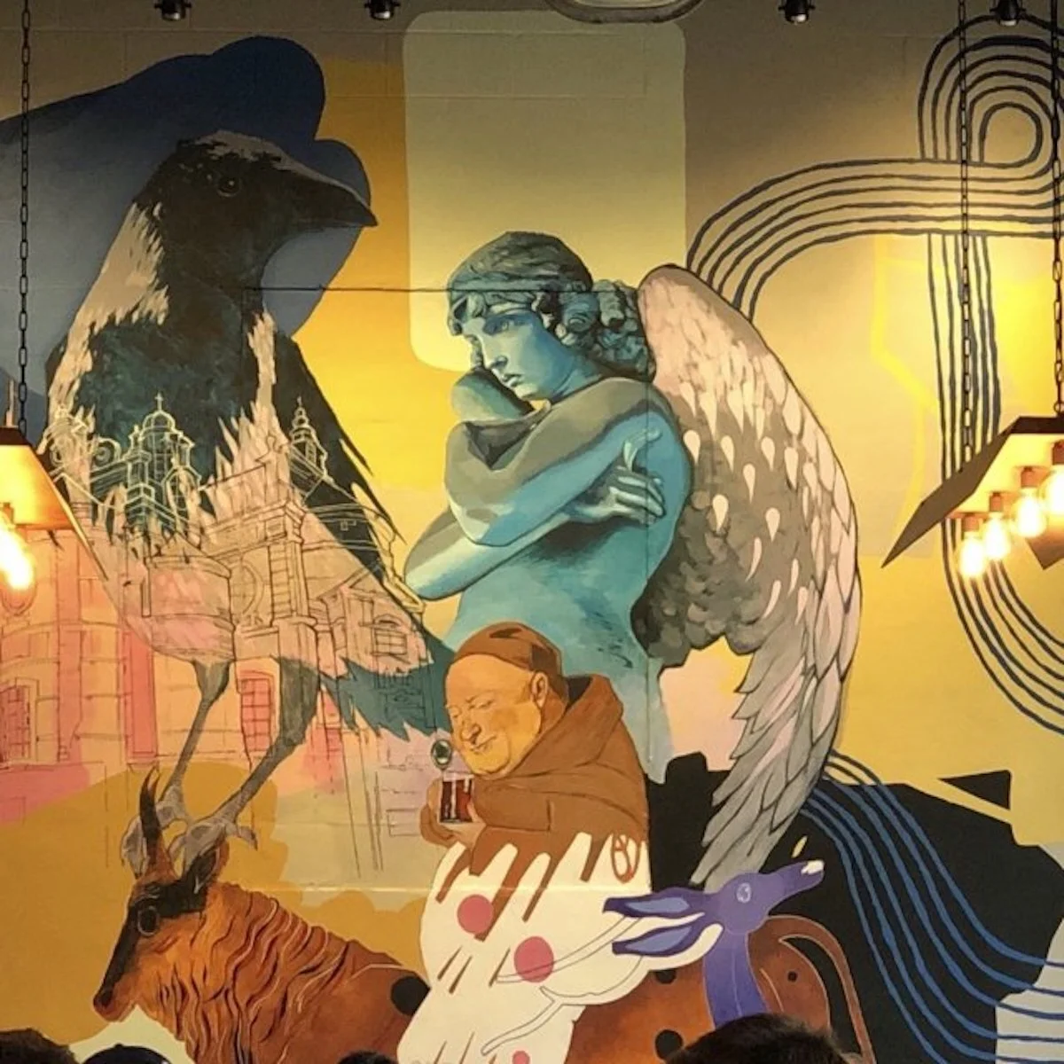 Bold Monk Brewery & Restaurant, Bar Dining Room (Detail). Hand-painted latex on plaster and cinder block. Concept and design: Super Delicious Walls.