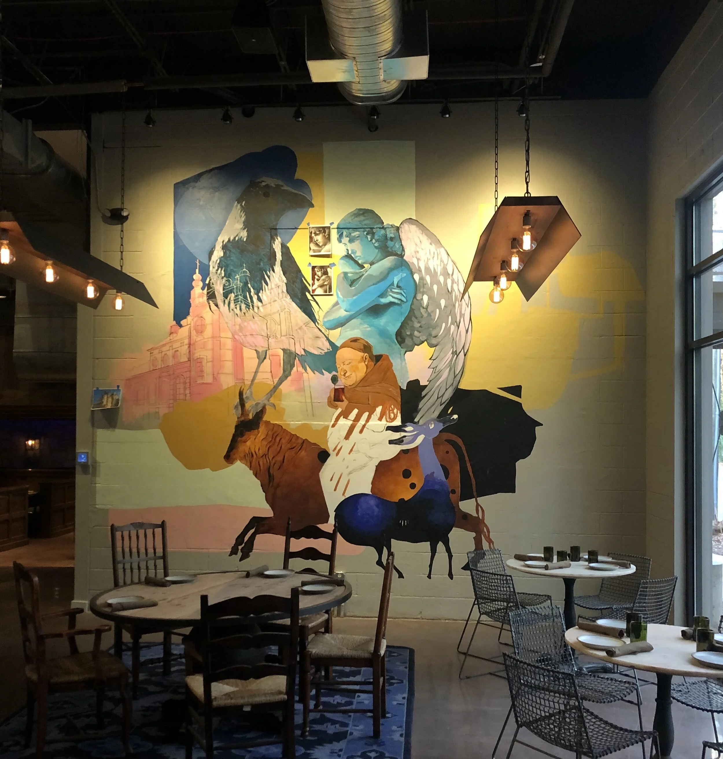 Le Fat Restaurant, Atlanta, GA. Bar dining room, matte lime plaster with hand-painted mural. Concept: Smith Hanes Studio, Design: Super Delicious Walls.